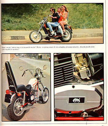 This is from a roadtest of the mad Fantic Chopper - 3 people on a 125 chopper, with no helmet? Madness..those were the days. Check out that cissy seat and the size of the lorry-like rear tyre. Fab!!