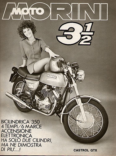 Another Italian classic, the Morini 350 Sport with wire wheels and drum brakes, and a woman with extremely permed hair draped all over it