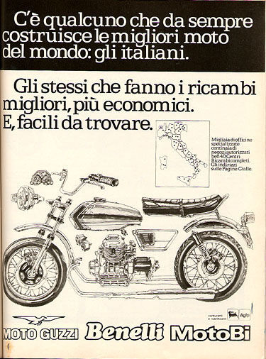 for the De Tommasso group of companies including Guzzi of the time. It translates; "There's someone who has always built the best bikes in the world - the Italians. The same people that produce the best spare parts at the best prices. And easy to find too"